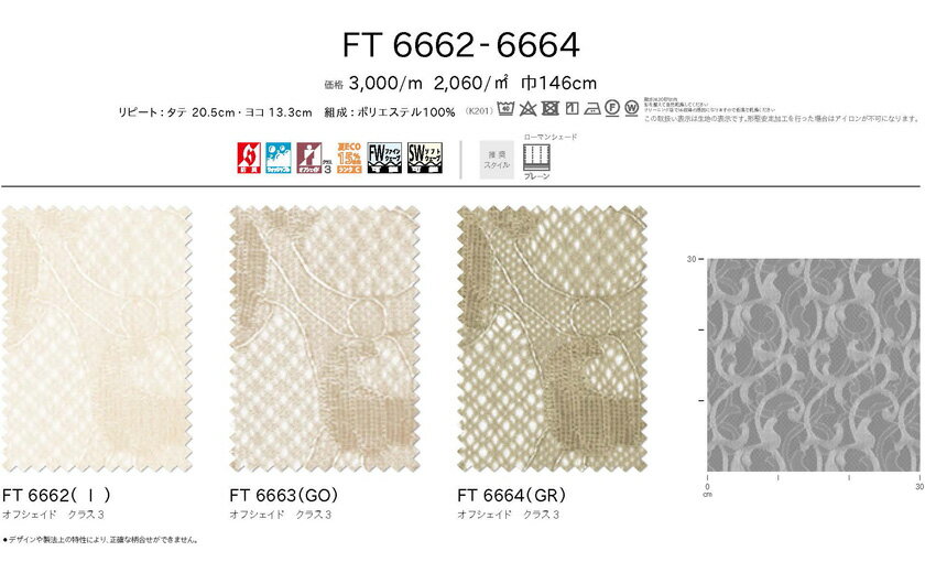 商品名川島織物セルコン FELTAシリーズ FT6662〜6664レース スタンダード縫製(下部3ッ巻仕様)フラット片開きサイズ幅、カン下寸法ともに1cm間隔で製作可能備考カーテン幅の寸法はカーテンレール両端の固定ランナー間より1.05倍程を推奨いたしております。